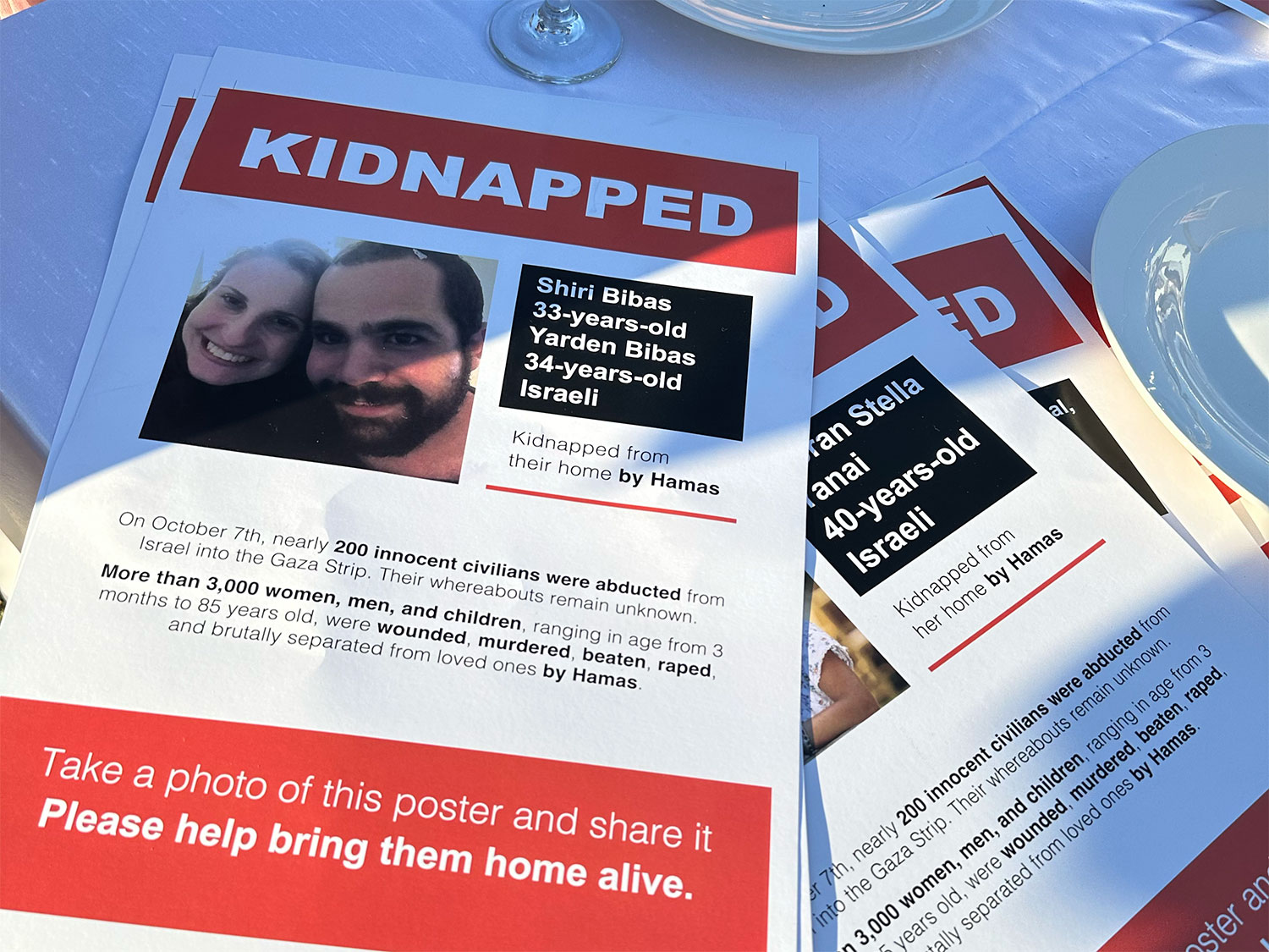 The owner of the Beverly Hills Tower, located at 499 N. Canon Drive, offered a long grassy strip to host the tables and chairs, which were lent free of charge by a rental company that the shul often uses for Bar and Bat Mitzvahs. One chabad member offered to print out fliers with a photo of each hostage, while another member volunteered to print out a banner bearing their names.