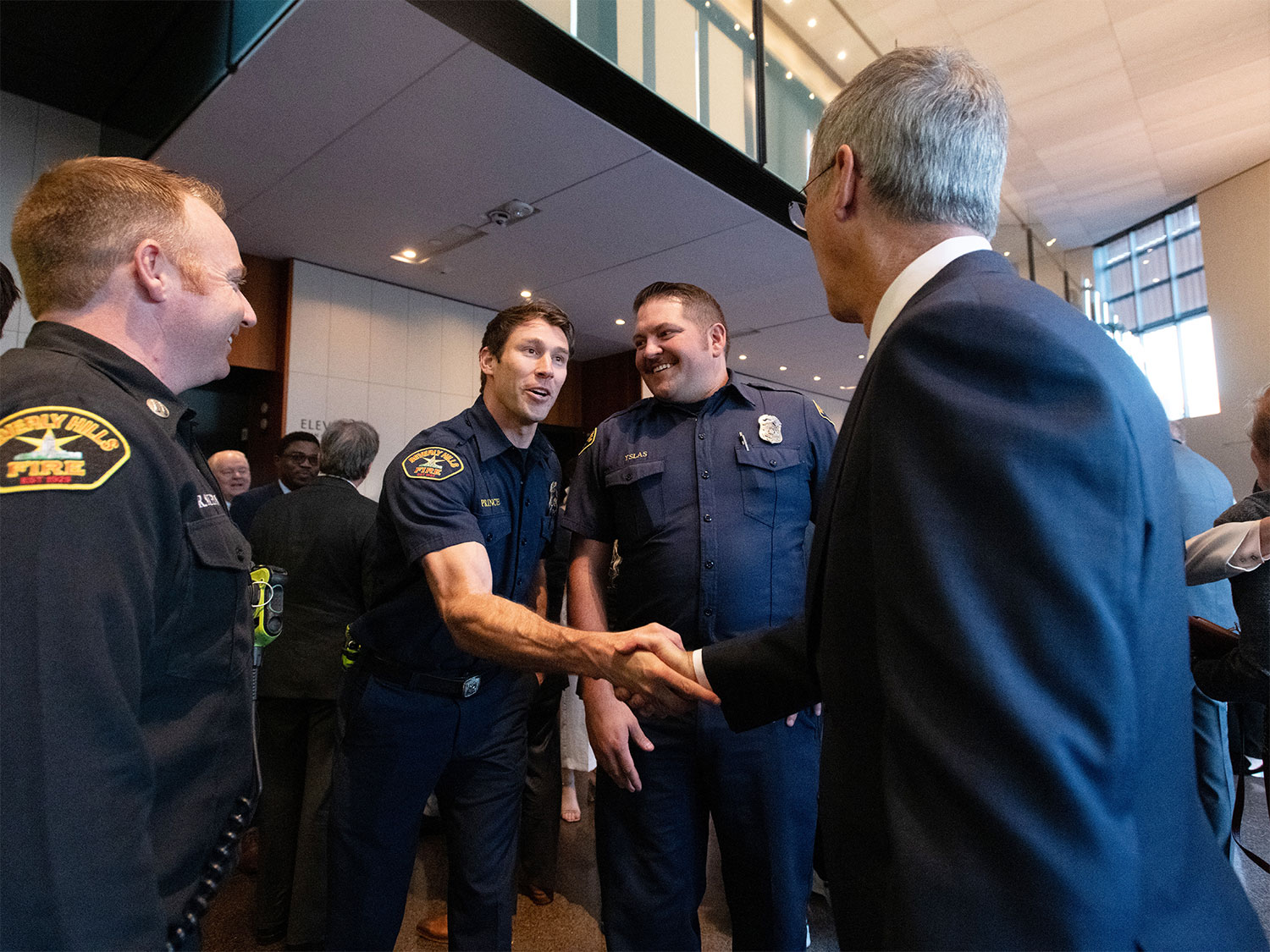 Beverly Hills Firefighter Austin Prince shakes hands with recently elected Councilmember Craig Corman.
