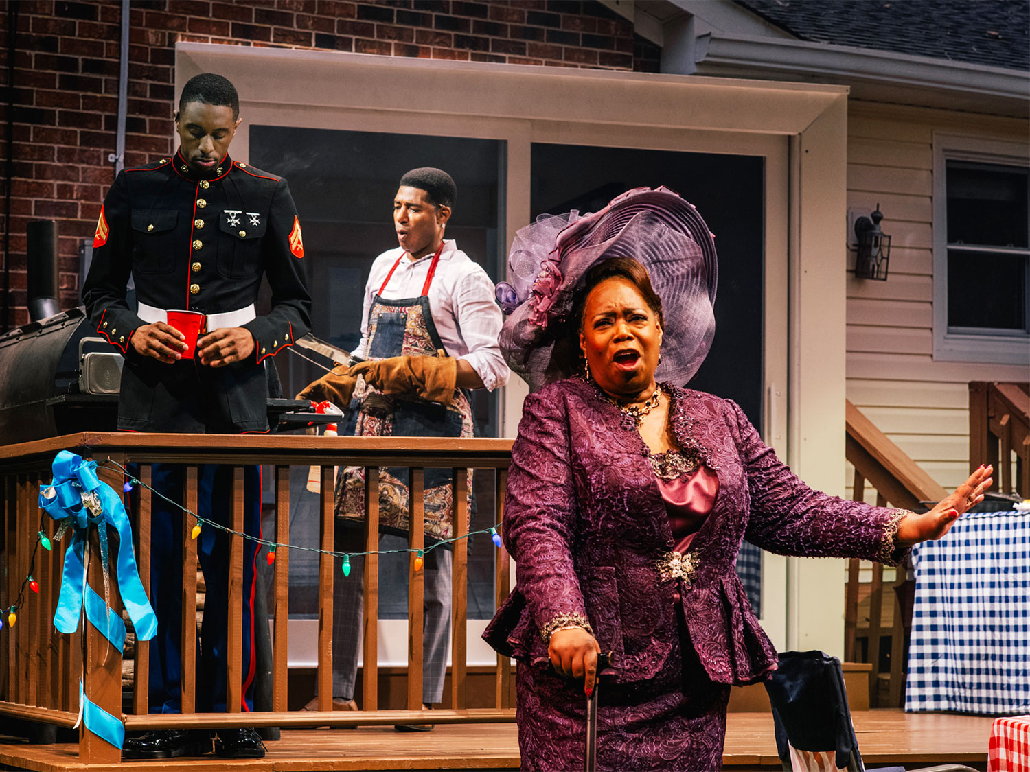 More guests arrive and Juicy has to entertain Rabby, fresh from services in her magnificently large purple feathered church lady hat with matching accessories, and her children Opal and Larry, childhood friends of Juicy’s. Larry, in his Marine uniform looking like a recruitment poster, and Opal, uncharacteristically in a dress she would like to rip to shreds, have their own secrets.