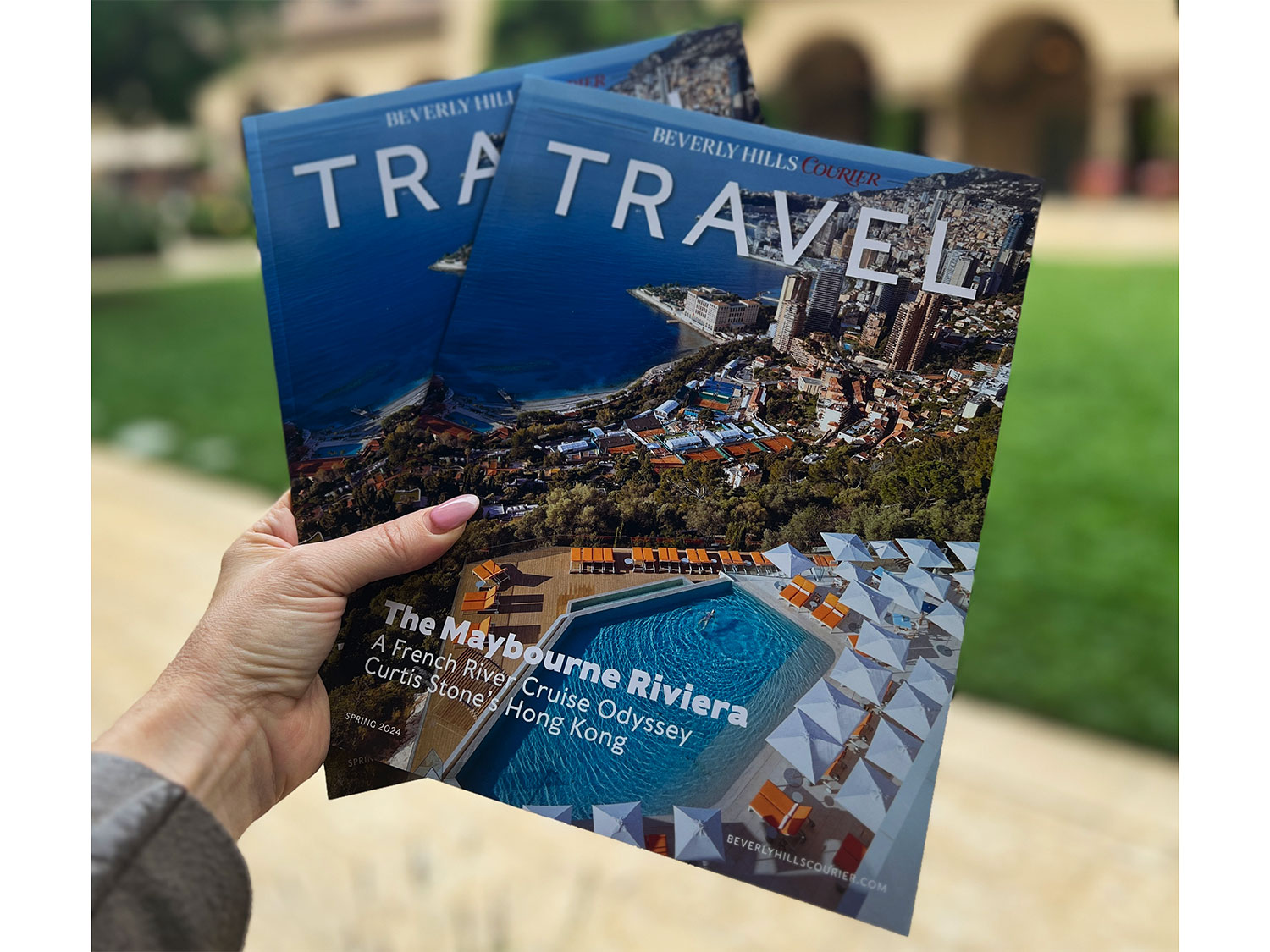The cover photo of Beverly Hills Courier Travel Magazine featured The Maybourne Riviera in the South of France.