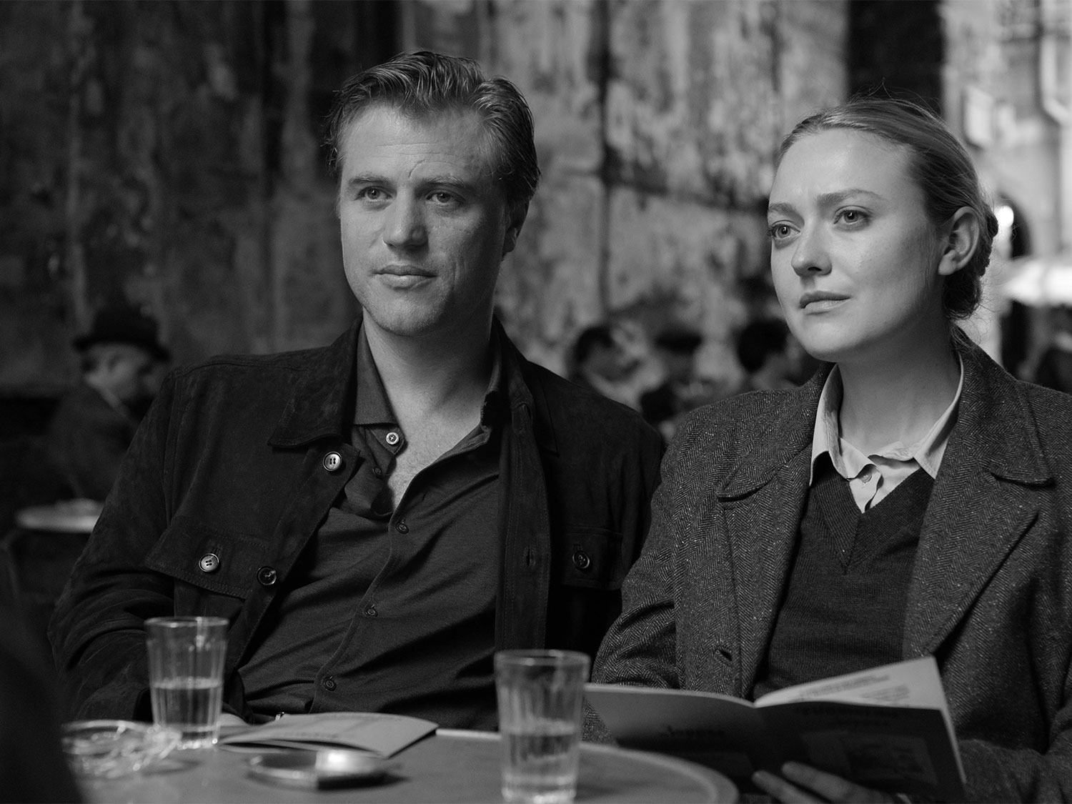 Scott’s Tom is well defined. Early on, lounging in his cramped, ill-kempt bedroom, he stretches and slides his arm over the dirty wall. The very movement is louche and the smirk on his drawn features marks someone trying to avoid a rough end. This is a man who always checks the coin return on a pay phone. Even his misstep at a tailor where he chooses “the maroon” dressing gown and is corrected, it’s burgundy, says the haberdasher; the first in a constant road of lessons that he will follow, never making the same mistake twice. He knows the general strokes but needs to finesse the details.