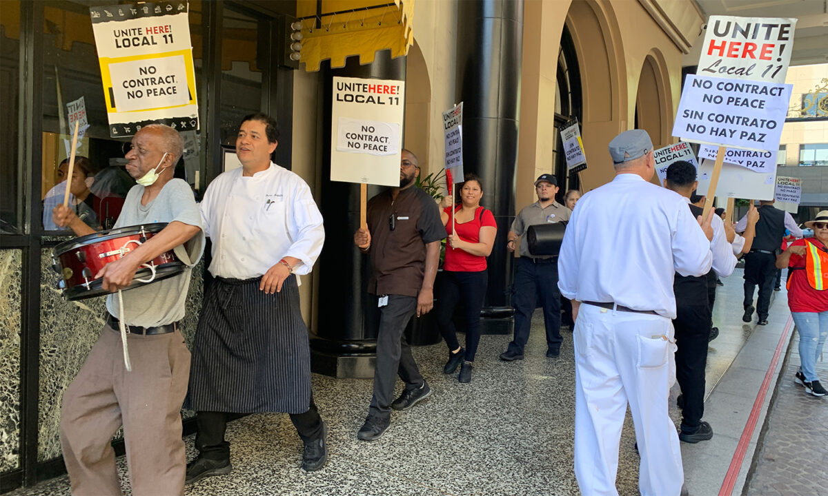 For the second consecutive week, non-striking demonstrators engaged in protests outside hotels in Beverly Hills while Unite Here Local 11, the labor union for hospitality workers, continued to coordinate rolling walkouts across Southern California.